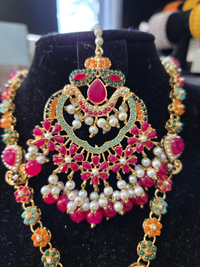 Four piece Jewellery set with main stone colour shocking pink. Ideal for Weddings Bridal Special occasions. Large maang tikka, chandelier earrings and graceful necklace